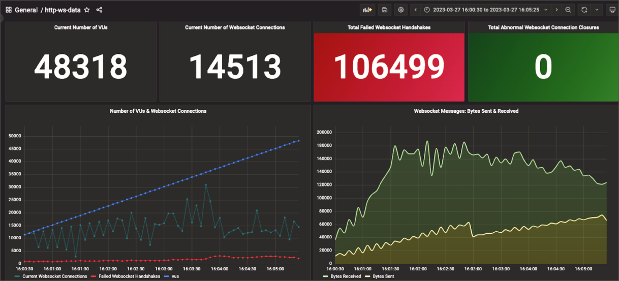 Includes custom WebSocket metrics using the Edamame k6 extension written in Go